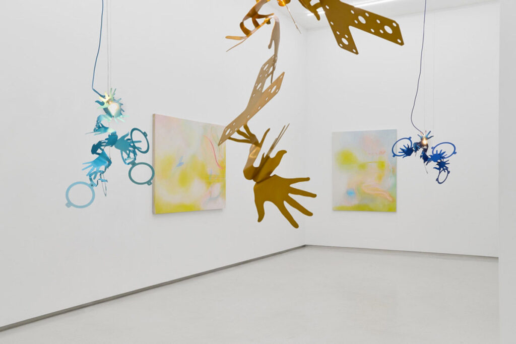 The exhibition Within Our Shapes features works by Nicolas Pelzer and Tal Regev. Pelzer’s sculptural installations explore the interaction between technology and its impact on contemporary values, creating pieces that reflect the divide between technology and organic forms. In contrast, Tal Regev’s ethereal and layered paintings delve into the tension between inner energy and outward expressions, seeking light and meaning just beyond the visible surface.