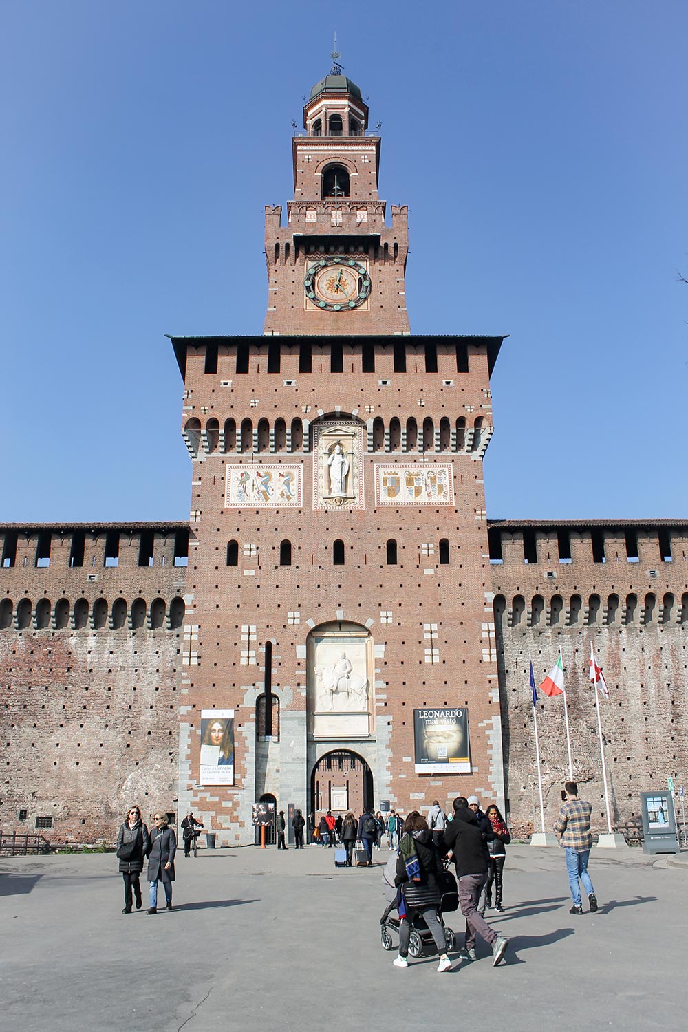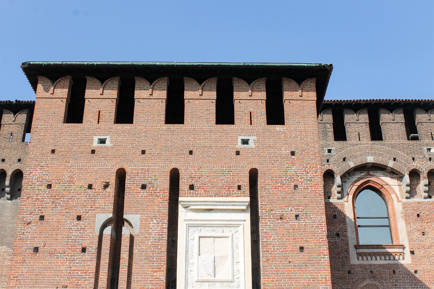 Il Castello Sforzesco è un vasto quadrilatero di mattoni, diviso all'interno in tre cortili, ricostruito a partire dal 1450 sull'area di un precedente edificio difensivo per volere del duce Francesco Sforza, fondatore della dinastia. Durante la seconda metà del Quattrocento ha rapidamente assunto l'aspetto che lo caratterizza, con il coinvolgimento dei migliori architetti e degli artisti presenti a Milano.
