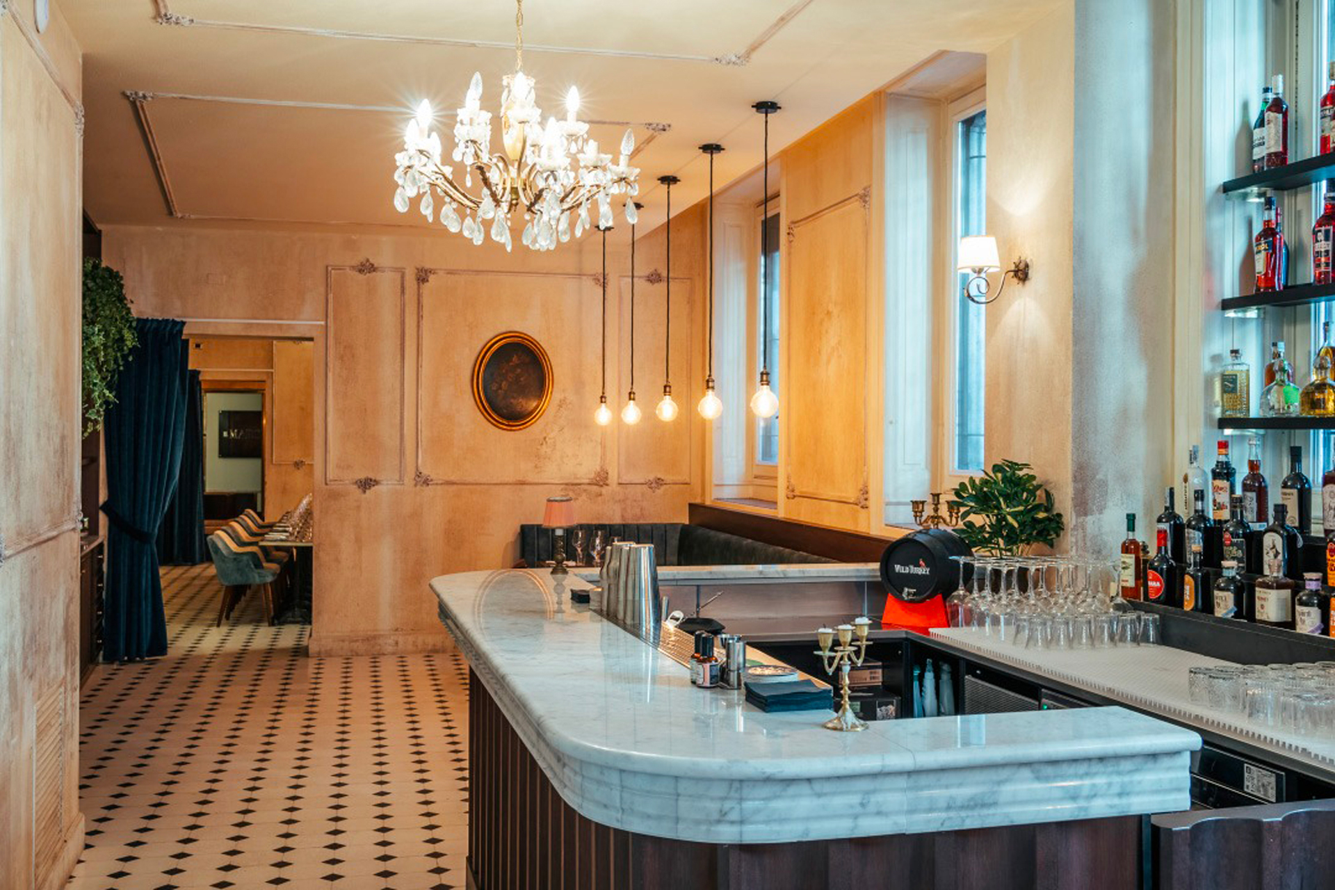 Il cuore del locale è la corte centrale ovale, con maestose colonne che fanno da quinta scenica alla cucina, al cocktail bar a vista e al piccolo palco dedicato all’accompagnamento musicale live. Accanto, un ambiente unico nel suo genere: un intimo e prezioso “ristorante nel ristorante”, ovvero una sala con cucina e cocktail bar privati da riservare per eventi e ricorrenze, con tanto di chef e barman dedicati. Completa il locale un’altra grande sala con affaccio su strada per celebrazioni speciali.